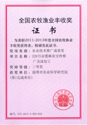 淄博市农业科学研究院王光明研究员主持的“220万亩蓖麻杂交种推广及深加工”项目2013年12月荣获全国农牧渔业丰收叁等奖。