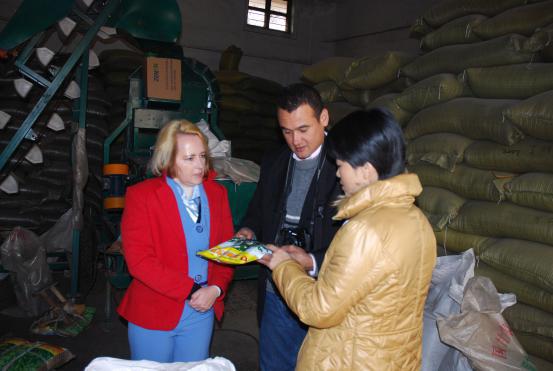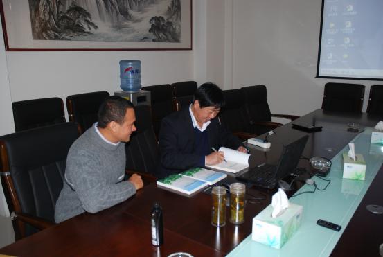 Nanny Katharina (Kate) Bahnsen总裁介绍该公司蓖麻产业规划 王光明院长给Carlos Andres Palacio Lopera先生一行签名赠送王光明院长主编的《蓖麻育种与栽培》一书留念 Nanny Katharina (Kate) Bahnsen总裁和Carlos Andres Palacio Lopera先生参观淄博市农业科学研究院的蓖麻杂交种包装车间