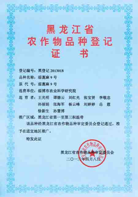 淄蓖麻9号审定(登记)证书